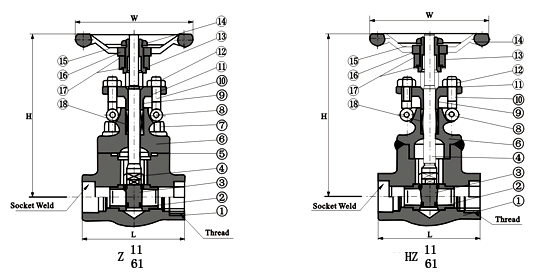 Z61H/Y、HZ61H/Y、HZ11H/Y型锻钢内螺纹、承插焊闸阀 主要连接尺寸及重量
