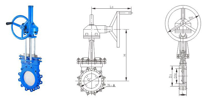 伞齿轮刀形闸阀主要外形及连接尺寸(mm):PZ573H、PZ573X、PZ573Y、PZ543H、PZ543F、PZ543X